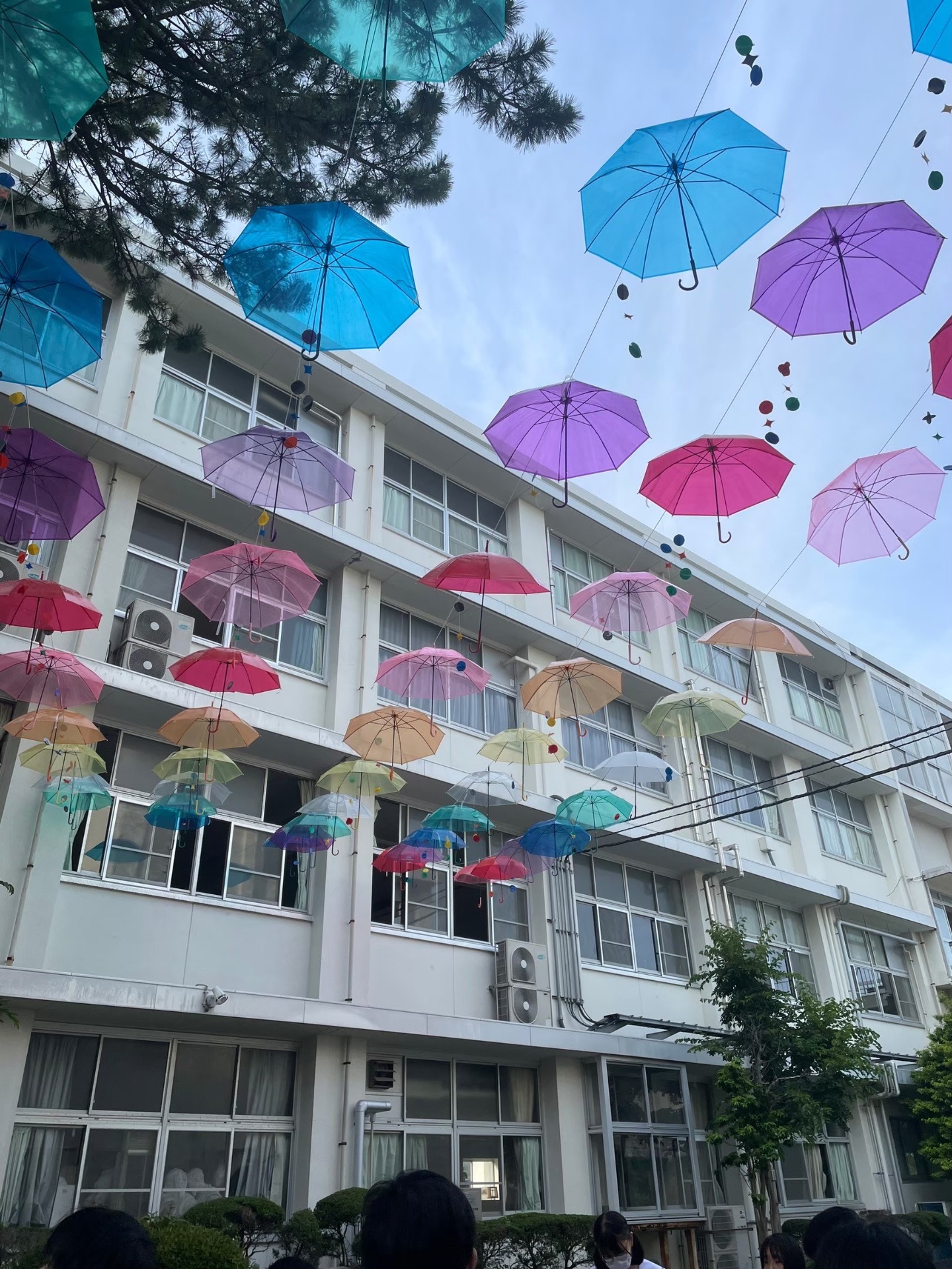 正面玄関の上を見上げると沢山の傘が飾られており、それらが光を受けて色とりどりの影を地面に映し出しています。是非じっくりとご覧ください。